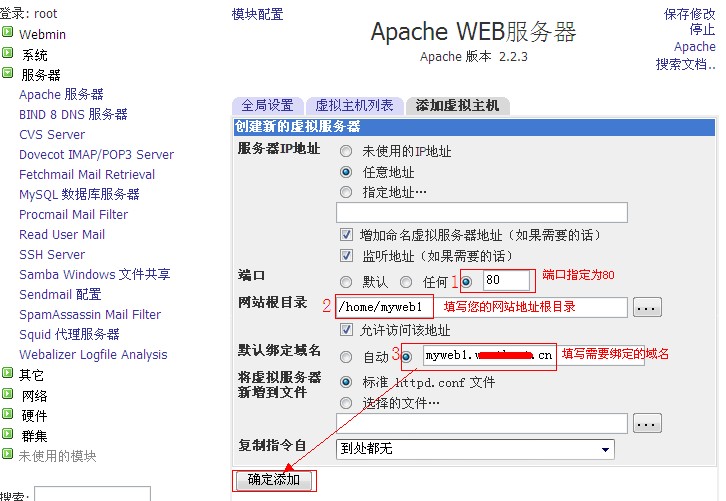 b、填寫端口80、網站根目錄、默認綁定的域名,然后點確定添加。如圖: