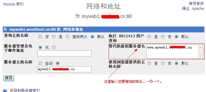 e、在替代的虛擬服務器名填寫您的域名,一行一個。然后點保存,如圖:
