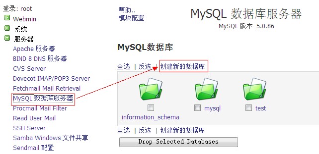 6、最后是建立數據庫了: a、點擊左側的“服務器”—“mysql數據庫服務器”,然后點擊右側的“創(chuàng)建新的數據庫”如圖: