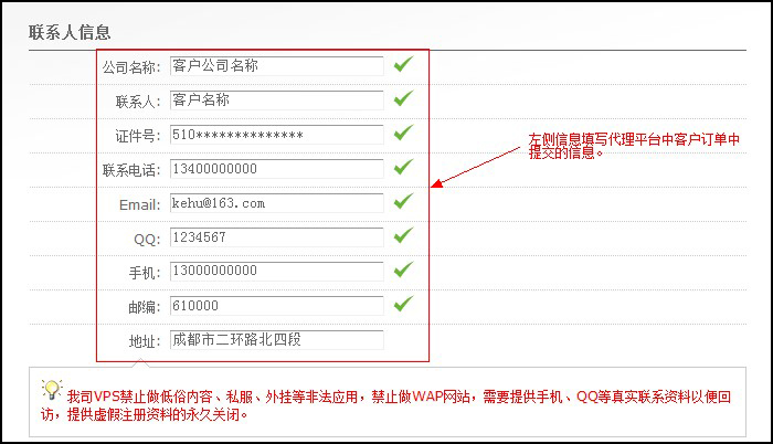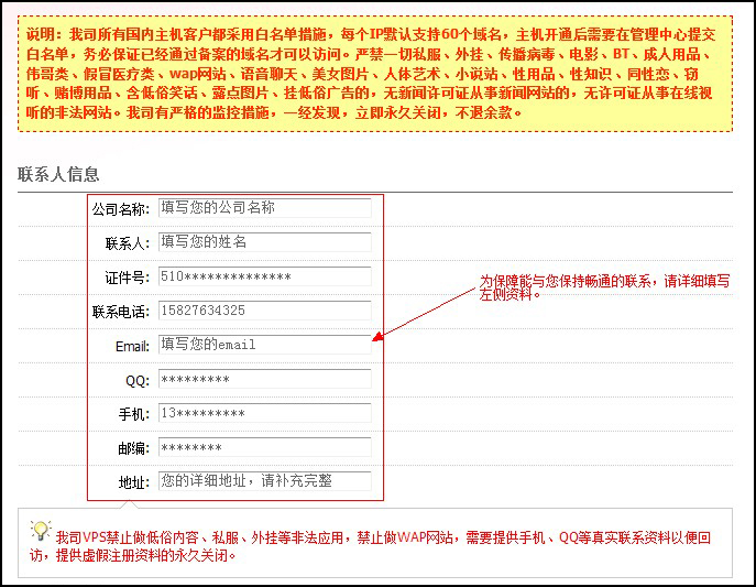 為保障服務(wù)質(zhì)量,能在任何時(shí)候聯(lián)系到您,聯(lián)系人信息部分,請(qǐng)務(wù)必填寫真實(shí)有效信息,否則審核時(shí)VPS可能會(huì)斷網(wǎng)。 同時(shí)我司用紅色字體標(biāo)注了不允許防止的內(nèi)容,請(qǐng)仔細(xì)閱讀,一經(jīng)發(fā)現(xiàn)違規(guī)內(nèi)容將立即永久關(guān)閉。如圖: