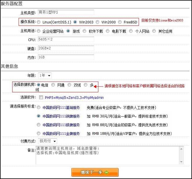 服務(wù)器配置部分,請(qǐng)選擇您需要的操作系統(tǒng),目前我司僅支持linux(centos5)和win2003,選擇機(jī)房時(shí),請(qǐng)根據(jù)您本地 的線路和客戶群的線路選擇適合的機(jī)房。選裝軟件請(qǐng)打鉤。如圖: