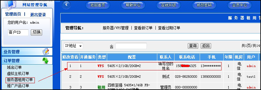 客戶在代理平臺(tái)提交訂單后,管理員可以登陸代理平臺(tái)后臺(tái),在“訂單管理”—“服務(wù)器租用訂單”看到VPS的訂單,并按照訂單 要求在我司開通VPS。如圖(客戶訂單):