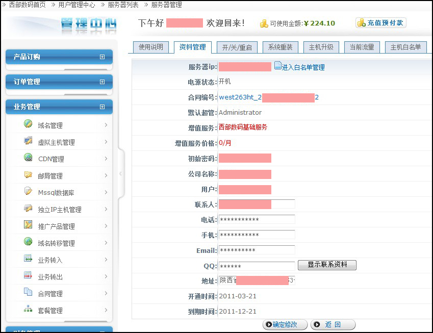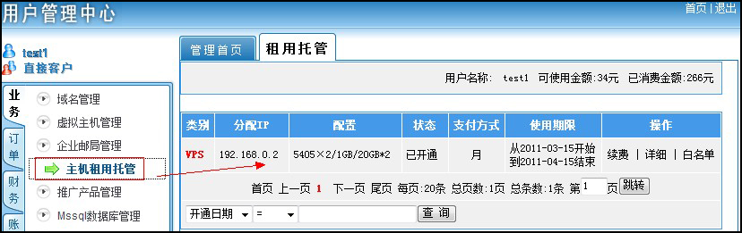 管理員開通后,客戶即可在自己的管理中心查看到相關(guān)的價(jià)格、到期日期、VPS登陸賬戶及密碼等信息,若要提交白名單和 更多管理,請(qǐng)點(diǎn)擊最右側(cè)的“白名單”或直接登錄www.myhostadmin.net。如圖: