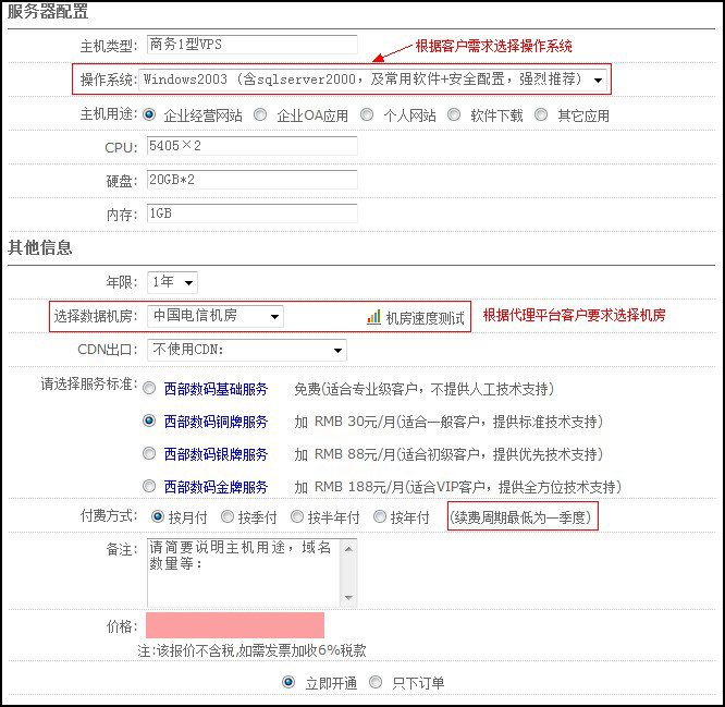 “服務(wù)器配置”部分,選擇操作系統(tǒng)時(shí)請(qǐng)根據(jù)客戶在代理平臺(tái)提交時(shí)選擇的類型來選擇。 “其他信息”部分,選擇機(jī)房時(shí)請(qǐng)根據(jù)客戶在代理平臺(tái)提交時(shí)選擇的線路來選擇。若您賬戶下有款可以點(diǎn)擊直接開通,若無足夠款項(xiàng)可以選擇只下訂單,然后勾選“我已閱讀并同意 西部數(shù)碼主機(jī)租用協(xié)議”。如圖(服務(wù)器配置和其他信息):