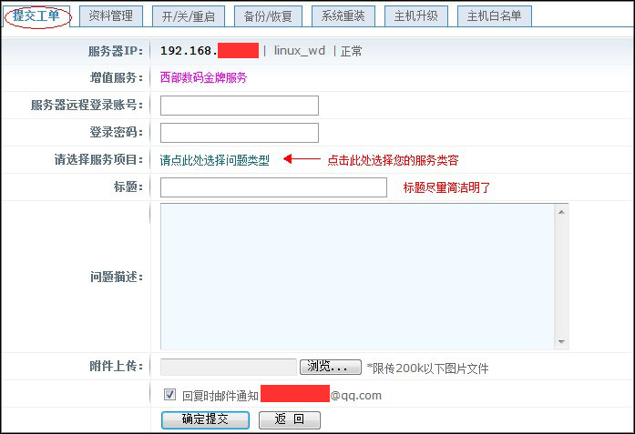 選擇需要維護(hù)的服務(wù)器,點(diǎn)對應(yīng)的工單按鈕提交工單,選擇您的問題類別,并提交詳細(xì)問題,就可以了,如圖: