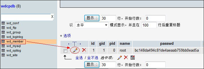 2、點(diǎn)擊左側(cè)wdcpdb數(shù)據(jù)庫,打開“wd_member”表。如圖: