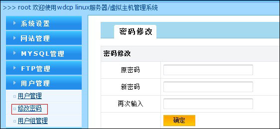 退出phpmyadmin,用賬號root,密碼123456登錄wdcp,登錄后請點(diǎn)擊左側(cè)的“用戶管理”——“修改密碼”,修改為您自己方便記憶且較復(fù)雜的密碼。如圖: