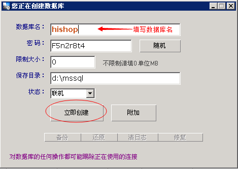 2.輸入mssql數(shù)據(jù)庫名,不可與已創(chuàng)建的其他數(shù)據(jù)庫重名,密碼為了保證復雜性,可以使用系統(tǒng)自動生成的密碼,不做修改。然后點“立即創(chuàng)建”即可。