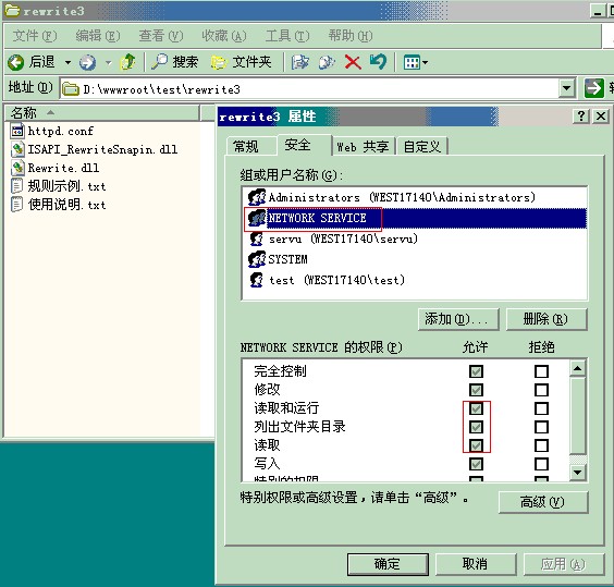 2.將文件夾rewrite3復(fù)制到需要設(shè)置偽靜態(tài)的站點(diǎn)目錄,如d:\wwwroot\test\rewrite3,并檢查目錄是否包含network service權(quán)限,最低需要給讀取權(quán)限,如果沒有請?zhí)砑?br/>