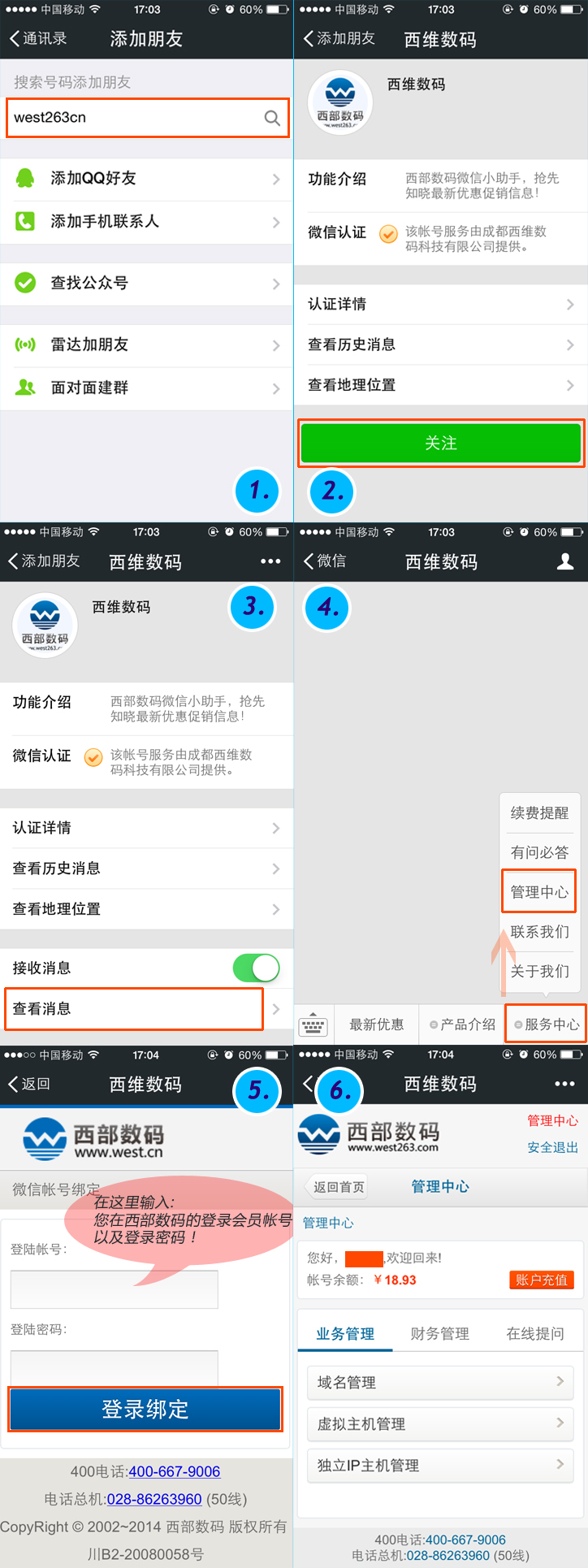 打開微信手機,添加朋友,搜索西部數碼微信號:west263cn,關注西部數碼微信號。進入管理中心,系統(tǒng)將自動提示您輸入帳號密碼綁定!如下圖所示!