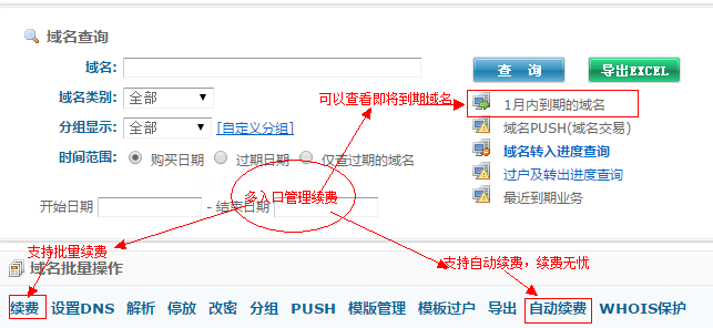 在域名管理界面中,選擇【1個(gè)月內(nèi)到期的域名】-可以查看近期不同時(shí)間到期的域名以續(xù)費(fèi);選擇【域名批量操作-續(xù)費(fèi)】或【域名批量操作-自動(dòng)續(xù)費(fèi)】可以批量對(duì)多個(gè)域名續(xù)費(fèi)。