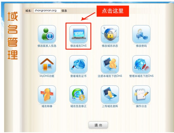 4、點擊域名后將打開如下頁面,點擊【修改域名DNS】。