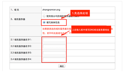 5、進入修改DNS頁面,先將域名服務器選擇為【填寫具體信息】