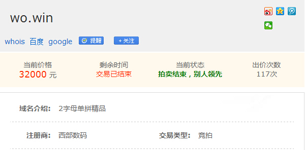 17.win可以解釋為“一起贏”本身是一個兩位數(shù)保留域名,拍賣過程中經(jīng)過了88次競價,最終拍出46000元。wo.win可以理解為“我贏”,是一個兩字母域名,經(jīng)過117次競價,最終拍出32000元。