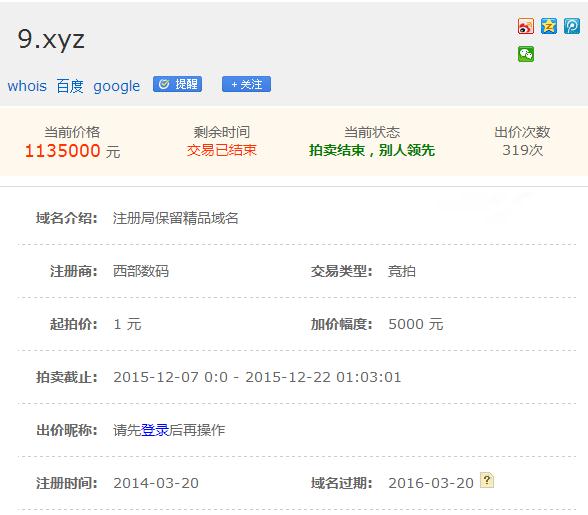 繼極品單數(shù)字域名6.xyz 和8.xyz分別以80萬(wàn)元人民幣和52萬(wàn)元人民幣高價(jià)結(jié)拍后,9.xyz也壓軸登場(chǎng),“9”與漢字“久”“酒”同音,被當(dāng)成是代表“長(zhǎng)久”的數(shù)字,酒文化的象征;同時(shí)“9”也有“九五之尊”寓意美好之意,建站好用,也是投資上的佳品。 域名投資人小皮就曾以短短幾分鐘一口價(jià)買入一枚單數(shù)字域名9.com.cn,交易價(jià)格近200萬(wàn)元!而已被啟用的域名9.cc現(xiàn)已建成“9點(diǎn)嘻嘻娛樂(lè)城”網(wǎng)站,據(jù)”樓盤網(wǎng)”創(chuàng)始人戴躍介紹,當(dāng)時(shí)“9.cc”價(jià)格更是不菲,將近百萬(wàn)元人民幣。2007年,視頻網(wǎng)站6間房也以百萬(wàn)級(jí)的價(jià)格收購(gòu)單數(shù)字域名了6.cn。 俗話說(shuō):“物以稀為貴”,此次結(jié)拍的單數(shù)字域名9.xyz本身就是極其罕見(jiàn)的品種,是當(dāng)之無(wú)愧的硬通貨域名,每個(gè)后綴總共只有10個(gè)。其中不乏3.cn、6.cn這樣的大終端對(duì)于單數(shù)字域名的應(yīng)用,搶手程度可見(jiàn)一斑。 據(jù)調(diào)查,近年來(lái),隨著字母域名的日漸稀少,數(shù)字域名,尤其是單數(shù)字域名儼已成當(dāng)下域名投資的熱點(diǎn),尤其在今年,更是迎來(lái)爆發(fā)期。 域名因自身屬性,注冊(cè)一個(gè),就少一個(gè)。就數(shù)字域名而言,尤其對(duì)單數(shù)字域名來(lái)說(shuō),那更是稀罕至極了。再加上單數(shù)字域名全球通用,不分國(guó)家,不分語(yǔ)言,不分行業(yè),終端應(yīng)用范圍非常廣泛。而且,收購(gòu)者都是大終端,意愿非常強(qiáng)烈,價(jià)格自然不菲。 所以,未來(lái)市場(chǎng)相信還有更多的域名投資者將目光瞄向單數(shù)字,可以預(yù)見(jiàn)的是,往后單數(shù)字域名或其他較為冷門的域名類型,會(huì)逐漸在市場(chǎng)中嶄露頭角。 目前,我們還不知道9.xyz是否會(huì)啟用,但是從行情來(lái)看,未來(lái)單數(shù)字域名還將持續(xù)升溫,并且單數(shù)字域名在品牌推廣上很有優(yōu)勢(shì)。像京東這樣知名的公司都啟用了3.cn,也是看重這點(diǎn)。而我們從此次的成交價(jià)格可以看出.xyz域名的價(jià)值也正在受到更多人的認(rèn)可,自谷歌重組更名Alphabet,并大膽啟用abc.xyz后,更是掀起一陣注冊(cè)熱潮,搶手程度一目了然。西部數(shù)碼8元的注冊(cè)價(jià)格更可以說(shuō)是非常便宜。之前就有許多人就因?yàn)閤yz注冊(cè)局突然開(kāi)放3數(shù)字,8元就注冊(cè)到了3數(shù)字域名,大賺一筆。 不過(guò),在注冊(cè)或收購(gòu)域名的過(guò)程中,投資者既要時(shí)刻掌握市場(chǎng)行情,也要謹(jǐn)慎判斷,盲目投資域名的行為不可取。
