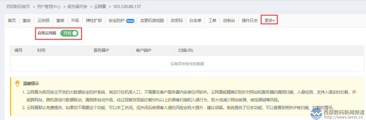 云網(wǎng)盾開啟/關(guān)閉操作步驟如下:登錄西部數(shù)碼云服務(wù)器管理中心——服務(wù)器管理——更多——啟用/關(guān)閉云網(wǎng)盾。