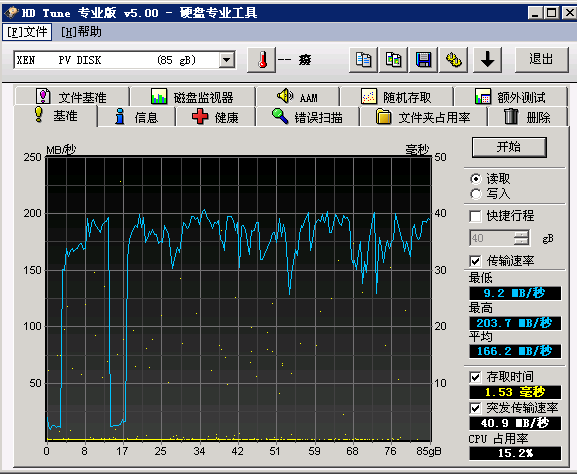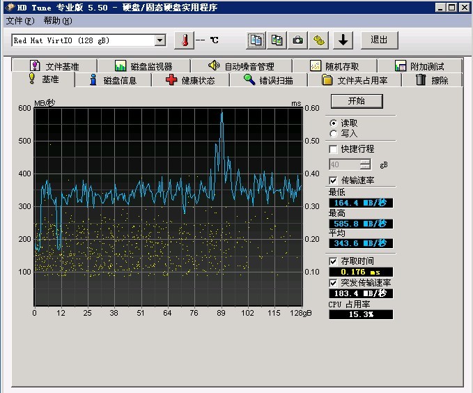 吞吐量主要指大文件的連續(xù)讀寫速度,在大文件的復(fù)制、備份等場景適用,用“HD Tune專業(yè)版”中的“基準(zhǔn)”測試功能即可測試出磁盤的吞吐量,一般傳統(tǒng)機械sata硬盤的順序讀寫速度為 :80~150M/s, SAS硬盤為150~200M/s,SSD固態(tài)硬盤為400~600M/s。