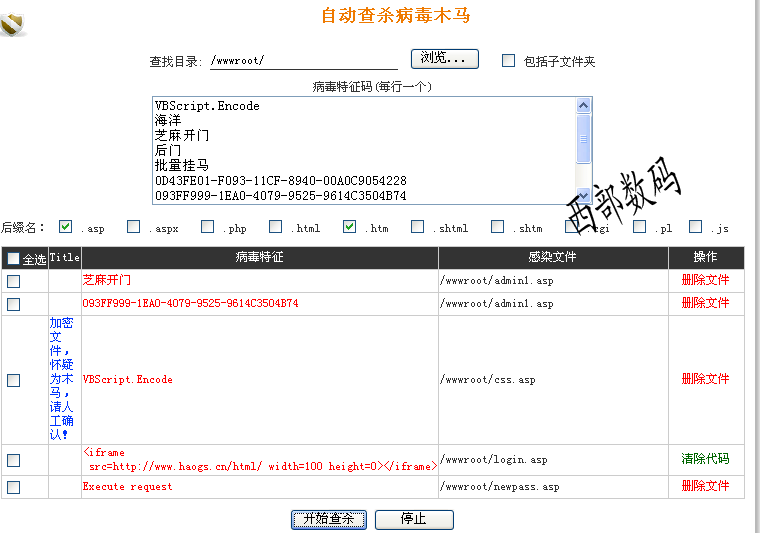 因傳統(tǒng)殺毒軟件不能有效地識(shí)別網(wǎng)頁木馬,特別是網(wǎng)頁木馬經(jīng)常被加殼或制作為變種!所以我司自主開發(fā)了專門針對網(wǎng)頁木馬的殺毒軟件,每天晚上自動(dòng)掃描所有網(wǎng)站。發(fā)現(xiàn)木馬的,對該文件自動(dòng)更名;發(fā)現(xiàn)iframe病毒的,對病毒代碼自動(dòng)清除;并自動(dòng)通過電子郵件通知你,讓您輕松掌握您的網(wǎng)站情況