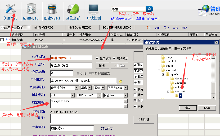 [原創(chuàng)]建站助手如何建立子站在一些門戶網(wǎng)站,網(wǎng)站不同板塊綁定不同域名,比如網(wǎng)易,新聞是news.163.com ,論壇是bbs.163.com 等等,如果您有網(wǎng)站想實現(xiàn)這個功能,并且網(wǎng)站所有板塊都是以文件夾方式放在主站wwwroot下, 使用建站助手.可以參考以下教材建立子站方式實現(xiàn)這個功能 本身是創(chuàng)建子站,所以默認主站就存在,如果沒有建站請參考:http://www.ps-sw.cn/faq/list.asp?unid=585 以主站www.myweb.com,子站為m.myweb.com域名,目錄是主站下的m目錄,為例(實際請更換為您自己域名和目錄): 1.再次點擊創(chuàng)建網(wǎng)站,在ftp名中使用****@主站ftp的格式(如m@myweb等等),再選中"生成子站"的復(fù)選框,如圖所示.