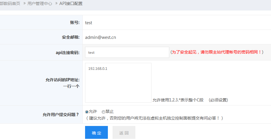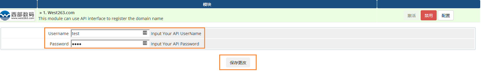 西部數(shù)碼whmcs域名商注冊插件安裝說明1. 下載插件到指定目錄 (WHMCS根目錄/modules/registrars/west263) 下載地址: http://downinfo.myhostadmin.net/doc/west263forwhmcs_utf8.zip?aaaaaaaa 圖示: 2. 激活并設(shè)置插件 進(jìn)入WHMCS管理后臺,在【系統(tǒng)設(shè)置】-【產(chǎn)品設(shè)置】-【域名注冊商】中選擇西部數(shù)碼,“激活”并進(jìn)行API接口參數(shù)配置 圖示: 3. 設(shè)置代理用戶名和密碼,并將服務(wù)器ip添加到"允許訪問的ip"中 圖示: