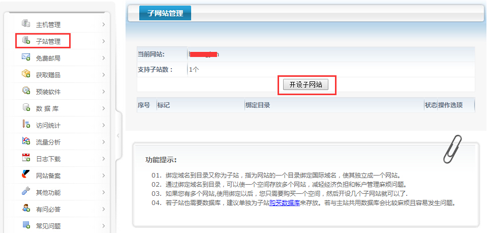 第二步:到管理中心,業(yè)務(wù)管理--虛擬主機(jī)管理--管理 進(jìn)入到主機(jī)管理,點(diǎn)擊子站管理