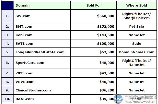 極品域名sw.com以455萬元霸氣奪冠!多個短字符域名表現搶眼