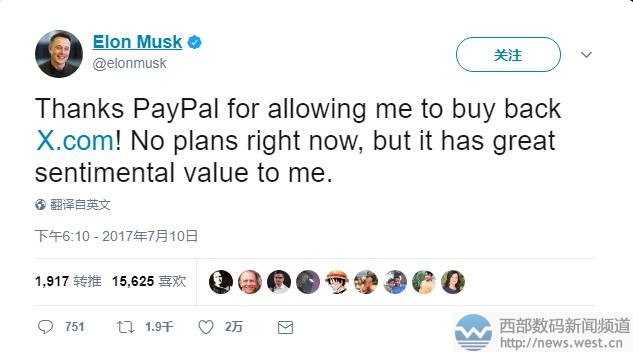 肥水不流外人田!極品域名X.COM又被Paypal前創(chuàng)始人買了回去西部數(shù)碼(west.cn)7月11日消息,上周我們報道全球知名支付工具Paypal疑似出售了極品單字符域名X.COM。近日,外媒曝出,該域名原來又被Paypal的前創(chuàng)始人Elon Musk買了回去,這可真是肥水不流外人田吶!