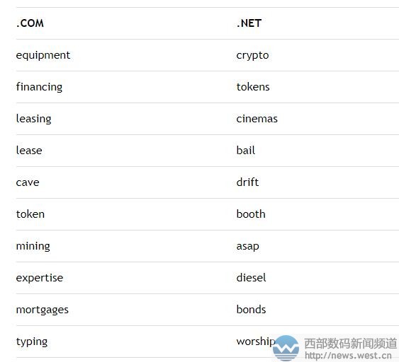 .com方面,“equipment”(設(shè)備,器材、配件)力壓眾多關(guān)鍵詞一舉成為最受歡迎的.com域名注冊詞匯。Equipment除了對應(yīng)有知名法國服飾品牌以外,本身還可以與多個行業(yè)多諸多詞語組合,可應(yīng)用的領(lǐng)域非常廣。 隨后是“financing”(融資、理財),作為一個金融類詞語,與此相關(guān)的域名可用來搭建投資理財?shù)冉K端平臺。同樣屬于金融行業(yè)詞的還有 “mortages”(抵押貸款),相關(guān)域名用來搭建抵押借貸平臺比較合適。 另外,兩個有著“租賃”之意的詞語“l(fā)easing”和“l(fā)ease”也成為6月份的注冊熱詞,可用于汽車、房產(chǎn)等多個行業(yè)租賃平臺。除此以外,“token”(代幣)、“mining”(采礦)、“cave”(洞穴)、“typing”(打字)均成為6月熱門注冊詞匯。 .net方面,兩個虛擬貨幣類詞語“crypto”(加密貨幣)、“token”(代幣)是6月最受歡迎的注冊詞匯。今年以來,虛擬貨幣行業(yè)的瘋狂發(fā)展,不僅使得相關(guān)域名成交價水漲船高,也催生了大批域名淵源不斷的被注冊。 隨后,“cinemas”(電影院)一詞在本月注冊量也極大,近年來,全球影視市場風(fēng)起云涌,不少大佬紛紛進軍電影領(lǐng)域,加上今年大片不斷,“電影院”人氣高漲。 除此以外,“bail”(保釋金)、“drift”(漂泊)、“booth”(售貨棚)等詞也榜上有名。 本文轉(zhuǎn)載自新聞資訊,原文鏈接:威瑞信6月月報:虛擬貨幣熱度不減!“crypto”再成最受歡迎域名關(guān)鍵詞