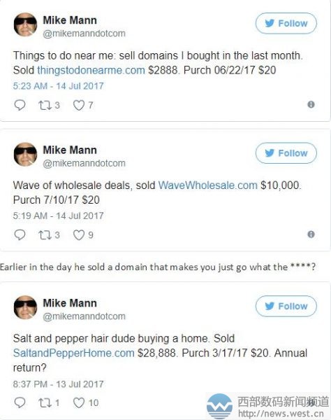 4天獲利500倍!論域名玩得溜,我只服Mike Mann西部數(shù)碼(west.cn)7月14日消息,說真的,小編每次報(bào)道Mike Mann的交易消息時,內(nèi)心都有止不住的羨慕嫉妒恨。尤其是今天這幾個域名的交易,小編真的有一種“老大爺?shù)沽硕疾环觥保ú灰?dāng)真),就服Mike Mann。