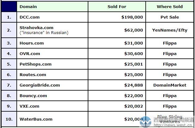 DN榜:三字母域名DCC.COM以134萬元奪冠!“保險”域名被終端拿下西部數(shù)碼(west.cn)7月14日消息,本期的DN交易榜(7.3-7.9)上,高價成交的域名還不少,一掃往日夏季域名市場蕭條的狀態(tài)。本期奪得DN榜冠軍的是三字母域名DCC.COM,成交價為19.8萬美金,約合人民幣134萬元。 域名DCC.COM注冊于1997年9月,距今快20年歷史了。作為ABB型域名,DCC.COM品相出眾,簡短易記,而且又是三聲母域名,對應(yīng)諸多豐富詞語,比如“多查查、調(diào)查處、冬蟲草、搭錯車、電磁場、大操場、電池廠”等,可廣泛用于醫(yī)療、科學(xué)、信息查詢、交通出行等領(lǐng)域,應(yīng)用空間很大。據(jù)了解,域名DCC.COM是私下交易的,其高達134萬元的成交價讓其躋身目前為止今年成交價最高的20強域名之列。 排名第二的是域名Strahovka.com,成交價為62,000美元,約合人民幣42萬元。這個域名注冊于2005年5月,是俄語中“保險”的意思,特別適合搭建保險行業(yè)終端網(wǎng)站。據(jù)whois查詢,域名Strahovka.com已在7月7日轉(zhuǎn)移到了終端買家payoneer.com名下。 隨后是以31,000美元和30,600美元在Flippa平臺成交的域名hours.com和ovr.com,約合人民幣21萬元。前者是英語常用單詞,是“小時、時辰”的意思,可用來搭建服飾、美容、以及在線電商等終端網(wǎng)站,應(yīng)用空間不錯。后者ovr.com則有“哦VR”的意思,適合用于虛擬現(xiàn)實領(lǐng)域。 本期榜單的第五名來自英文組合域名petshops.com,成交價為25,001美元,約合人民幣17萬元。該域名早在1996年就已注冊,其“寵物店、寵物商店”的含義清晰,指向明確,非常適合搭建寵物銷售網(wǎng)站或者寵物其他相關(guān)服務(wù)平臺。 另外,緊隨其后的域名routes.com也拍出25,0000美元價格,該域名是“路徑、路途”的意思,可搭建旅行相關(guān)平臺。其他域名,比如 “快活”Bouncy.com、vxe.com、“水上巴士”waterbus.com、“洋蔥”O(jiān)nions.com、“打印、印刷”Print.net等也以不錯價格成交。 其他交易域名詳見下圖: