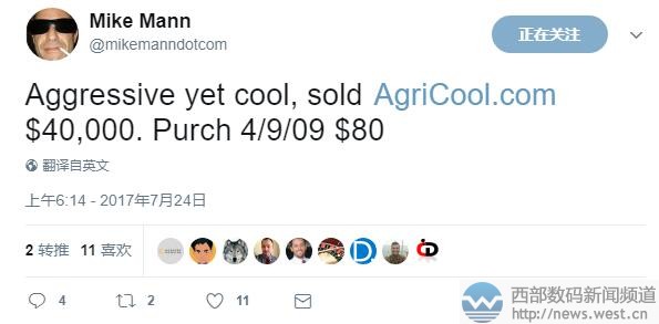 成本僅80美元!Mike Mann以27萬元售出“農(nóng)業(yè)”域名西部數(shù)碼(west.cn)7月25日消息,昨天國外大佬Mike Mann發(fā)推稱,英文域名AgriCool.com以40,000美元成交,約合人民幣27元。而這枚域名當(dāng)時(shí)的成本僅為80美元,人民幣539元。