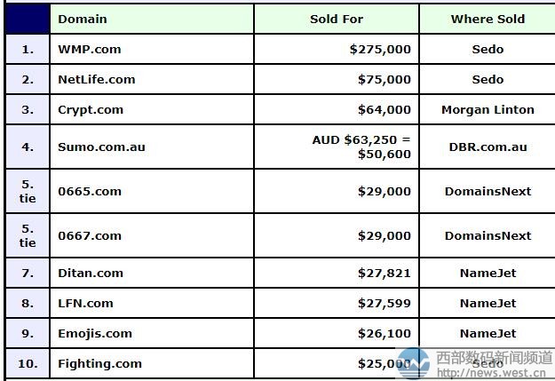 DN榜:域名WMP.COM以180萬(wàn)元奪冠!netlife.com近49萬(wàn)元結(jié)拍!西部數(shù)碼(west.cn)9月7日消息,本期 DN交易榜(8.21-9.3)上,三字母域名WMP.COM以275,000美元奪得第一,約合人民幣180萬(wàn)元。