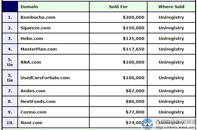 DN榜:印尼“康普茶”竟賣出132萬元! 多個英文域名六位數(shù)美金成交!西部數(shù)碼(west.cn)9月21日消息,最新一期的DN榜(9.11-9.17)被Uniregistry平臺此前交易但未公布價格的域名占據(jù)。其中,賣價最高的是一枚印尼語域名kombucha.com,成交價為200,000美元,約合人民幣132萬元。