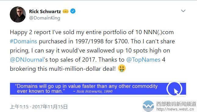 “域名大王”Rick一連出售10個三數(shù)字域名!美圖收購 “青年會所”域名西部數(shù)碼(west.cn)11月21日消息,據(jù)namepros在論壇曝料稱,近日知名投資大佬“域名大王”Rick Schwartz出售了包括346.com、348.com等在內(nèi)的10個三數(shù)字域名,交易總額達數(shù)百萬美元。與此同時,美圖秀秀公司拿下了英文組合域名PartyNow.com。