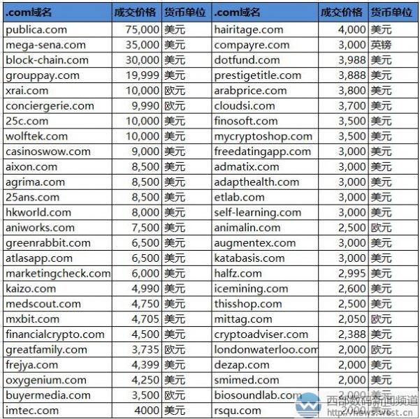 域名publica.com具有“國(guó)民”的意思,該域名注冊(cè)于1996年,距今已有22年歷史了。從含義上說,publica.com比較適合搭建公益類項(xiàng)目或者創(chuàng)意平臺(tái)。搜索發(fā)現(xiàn),目前就有新西蘭創(chuàng)意設(shè)計(jì)代理商publica與之對(duì)應(yīng),官網(wǎng)啟用域名publica.co.nz,另外海外出版經(jīng)濟(jì)電子商務(wù)平臺(tái)Publica也與之對(duì)應(yīng)。 排名第二的是組合域名Mega-Sena.com,成交價(jià)為35,000美元,約合人民幣23萬(wàn)元,該域名直譯為“萬(wàn)塞納”,對(duì)應(yīng)有巴西一個(gè)樂透彩票網(wǎng)。同樣為扁擔(dān)域名的block-chain.com,成交價(jià)為30,000,是“區(qū)塊鏈”的意思,對(duì)應(yīng)有當(dāng)下火熱的區(qū)塊鏈行業(yè),具有不錯(cuò)的商業(yè)價(jià)值。 隨后是一枚“支付”類域名grouppay.com,成交價(jià)為19,999美元,約合人民幣13萬(wàn)元。該域名有“集團(tuán)支付”的意思,目前已被一家名為GroupPay Inc的公司收購(gòu)并啟用建站。 接下來(lái)超五位數(shù)美元成交的還有域名xrai.com,成交價(jià)為10,000歐元,該域名中含有字母“AI”,有“人工智能”之意,也是當(dāng)前的熱門行業(yè)。另外,25c.com和wolftek.com都拍了1萬(wàn)美元,“門房”域名conciergerie.com拍了9990歐元,潛在終端是巴黎裁判所附屬監(jiān)獄。