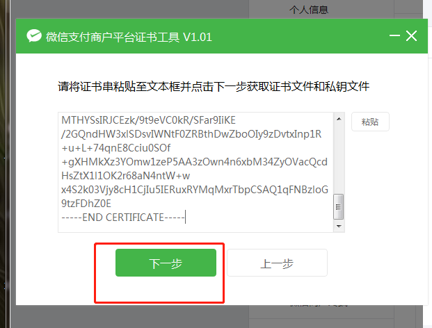 8、復(fù)制好證書內(nèi)容后,切換至【證書工具】頁面,點擊粘貼按鈕將【證書串】粘貼至證書工具頁面點擊下一步生成證書文件及私鑰文件