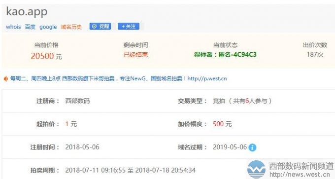 單拼域名kao.app在西部數(shù)碼五位數(shù)結(jié)拍!7月20日消息,.app域名自開放注冊以來,其受關(guān)注的程度一直居高不下,相關(guān)域名交易案例也時常傳出。據(jù)西部數(shù)碼最近成交記錄顯示,多枚.app域名完成交易,其中單拼域名kao.app以20,500元競拍,雙拼域名haoqing.app則以10,000元一口價被秒。