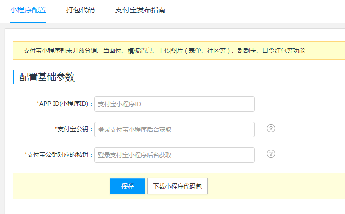 二、小程序發(fā)布1.代碼包下載代碼包下載是在平臺(tái)上下載小程序代碼包,自行通過(guò)支付寶開(kāi)發(fā)者工具上傳代碼并通過(guò)支付寶小程序平臺(tái)完成小程序?qū)徍恕⑿〕绦虬l(fā)布操作。 1.1配置小程序參數(shù)登錄管理后臺(tái),點(diǎn)擊【支付寶小程序】->點(diǎn)擊【小程序配置】,配置小程序的參數(shù):AppID(小程序ID)、支付寶公鑰和小程序應(yīng)用私鑰,AppID可登錄支付寶小程序后臺(tái)——小程序詳情頁(yè)直接獲取,小程序應(yīng)用私鑰需要下載支付寶密鑰生成工具生成(下載鏈接:https://docs.open.alipay.com/291/105971/),支付寶公鑰需要將小程序應(yīng)用公鑰上傳到支付寶小程序后臺(tái)獲取;