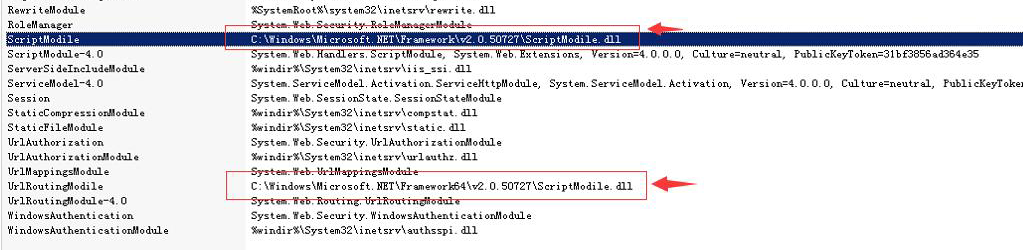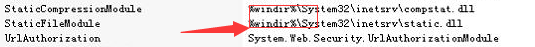 經(jīng)查看站點(diǎn)設(shè)置等信息,發(fā)現(xiàn)iis站點(diǎn)》模塊被加入了異常dll,如圖