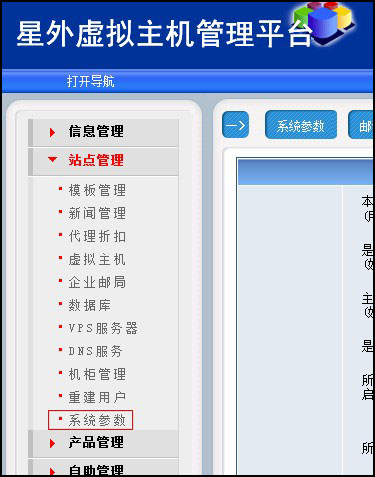 登陸后,點擊“站點管理”——“系統(tǒng)參數(shù)”,如圖: