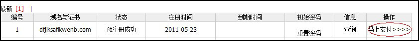 設(shè)置完成后即可開始注冊域名了,注冊域名前請確認在我司的賬戶下有足夠的款項,否則點擊“馬上付款”將會報錯。 注冊域名時,先查詢是否能注冊,能注冊的域名,填寫好個人資料,點擊“到下一步”, 系統(tǒng)會提示“預注冊成功,馬上付費>>>”,點擊后系統(tǒng)會轉(zhuǎn)到域名管理列表,您剛注冊的域名會提示“預注冊成功”,點擊最右側(cè)的“馬上支付>>>>” 就正式注冊成功了,如圖: