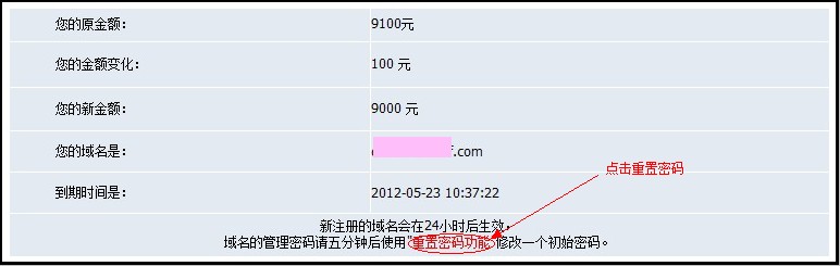 系統(tǒng)會提示您的域名到期時間和重置密碼的提示:新注冊的域名會在24小時后生效,域名的管理密碼請五分鐘后使用"重置密碼功能"修改一個初始密碼。點擊“重置密碼功能”,如圖: