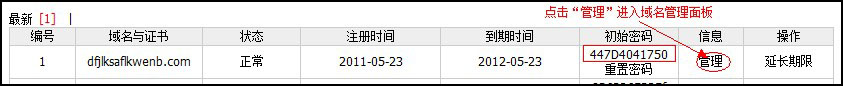 重置密碼后,會顯示一個初始密碼,點擊右側(cè)的“管理”就可以登陸域名管理面板了。如圖: