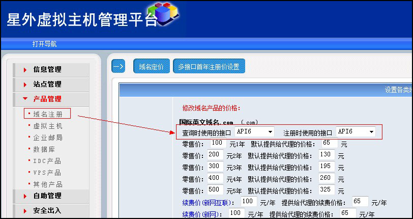 然后點擊“產(chǎn)品管理”——“域名注冊”,將右側(cè)的所有域名查詢接口和注冊接口都選擇“API6”,如圖: