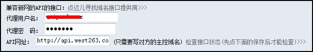 “系統(tǒng)參數(shù)”里的設(shè)置內(nèi)容很多,可以根據(jù)您自己的需要來選擇設(shè)置,設(shè)置域名接口的時候,先找到“域名接口部分”——“兼容新網(wǎng)的API的接口” 這里要求輸入代理用戶名、代理密碼以及API網(wǎng)址。代理用戶名和密碼參見說明文檔開頭設(shè)置的密碼。API網(wǎng)址填寫:http://api.west263.com。如圖: