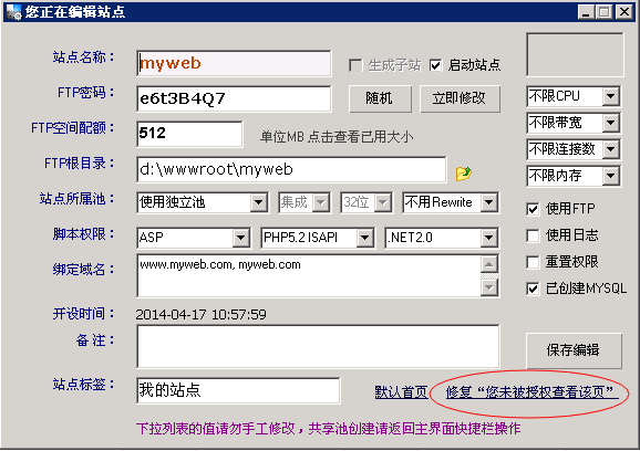 出現(xiàn)以上錯(cuò)誤是因?yàn)榫W(wǎng)站文件上傳后,網(wǎng)站文件的權(quán)限不足造成的。打開網(wǎng)站管理助手,雙擊有問題的站點(diǎn),或選擇該站點(diǎn)點(diǎn)擊