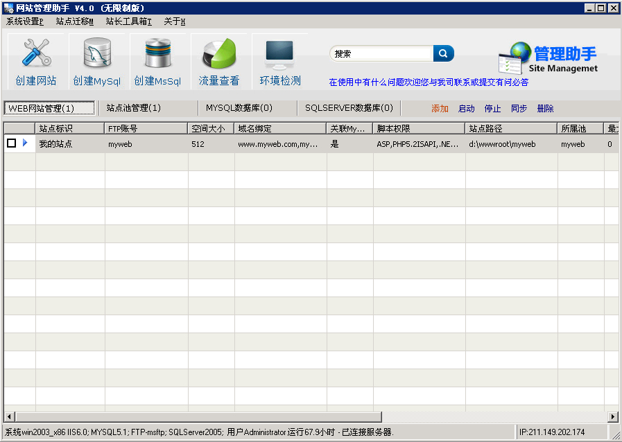 最后點(diǎn)“確認(rèn)創(chuàng)建”就新建完一個(gè)站點(diǎn)了。 提示框提示“MYSQL創(chuàng)建結(jié)果:Ture”表示mysql創(chuàng)建成功,若mysql創(chuàng)建失敗,請檢查mysql服務(wù)是否正常啟動(dòng)或系統(tǒng) 設(shè)置中mysql的路徑是否正確。