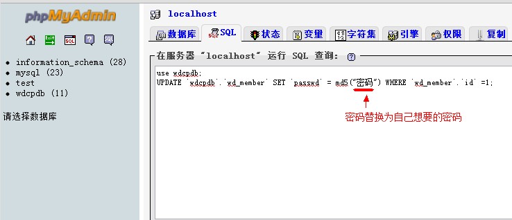[原創(chuàng)]wdcp系統(tǒng)無法登錄忘記密碼我司有兩個版本,早些時候是1.1的版本,現(xiàn)在新安裝的都是2.x的版本,重置方法如下:登錄phpmyadmin在線管理mysql,在訪問地址后面加phpmyadmin就可以進(jìn)行管理,賬號root,密碼是初始密碼(修改過root密碼請用修改后的密碼登錄),然后執(zhí)行以下sql語句,xxx請修改為自己需要的登錄密碼。use wdcpdb; |