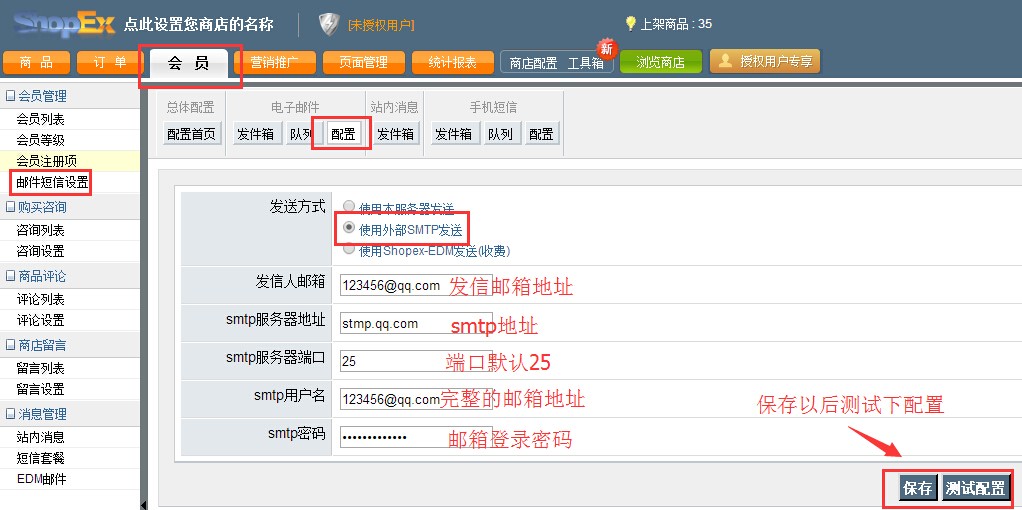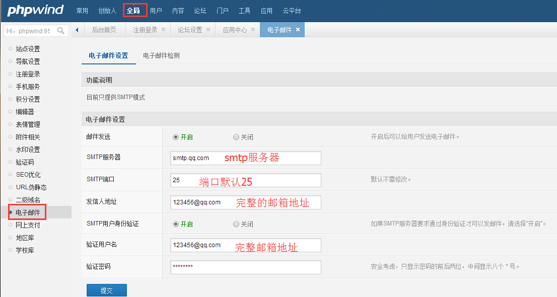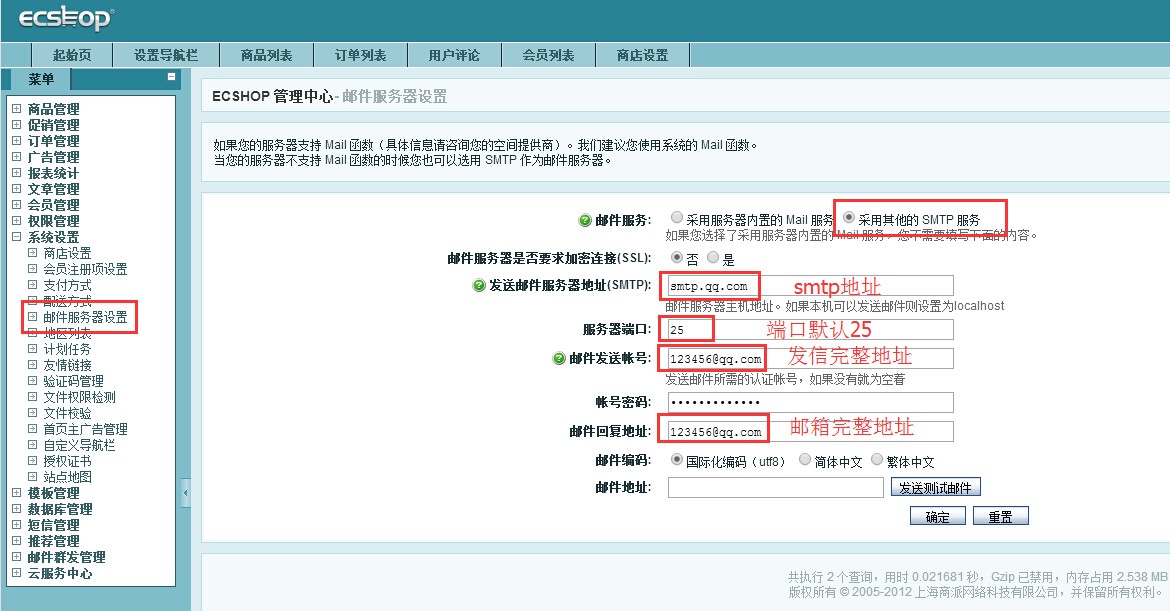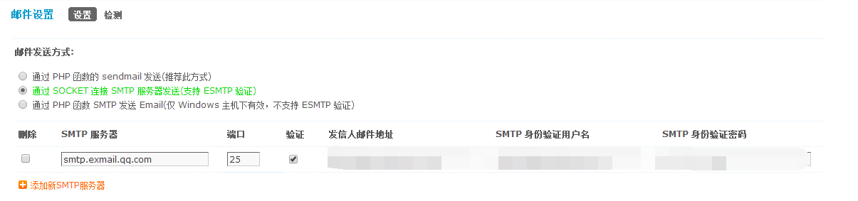 常見網(wǎng)站系統(tǒng)后臺(tái)配置smtp發(fā)送郵件現(xiàn)在大多數(shù)系統(tǒng)都有郵件發(fā)送功能,但有很多用戶不會(huì)配置導(dǎo)致程序郵件相關(guān)的功能不能正常工作。由于主機(jī)不支持mail函數(shù),網(wǎng)站要使用郵件發(fā)送功能就需要調(diào)用外部的smtp,同時(shí)郵箱自身也要開啟smtp/pop功能才可以正常調(diào)用。常見第三方smtp如下: 騰訊QQ郵箱(推薦):smtp.qq.com smtp/pop3開啟:http://service.mail.qq.com/cgi-bin/help?subtype=1&&id=28&&no=166 (注意騰訊郵箱要單獨(dú)設(shè)置安全碼 點(diǎn)擊查看說(shuō)明) 網(wǎng)易163郵箱:smtp.163.net smtp/pop3開啟:http://help.163.com/10/0312/13/61J0LI3200752CLQ.html(注意網(wǎng)易免費(fèi)郵箱smtp密碼要單獨(dú)設(shè)置 點(diǎn)擊查看說(shuō)明) 騰訊企業(yè)郵箱:smtp.exmail.qq.com Gmail郵箱:smtp.gmail.com。壳癵mail在國(guó)內(nèi)一般用不了) 我司郵局smtp地址:smtp.yunyou.top 我司郵箱不提供批量群發(fā)服務(wù),如需批量發(fā)送,建議購(gòu)買EDM:http://www.ps-sw.cn/web/edm/ 注意:設(shè)置調(diào)用第三方smtp均需要對(duì)方開啟smtp服務(wù),設(shè)置正確若不能發(fā)送需要檢查核實(shí)賬號(hào)密碼是否正確。 以下是常見系統(tǒng)設(shè)置(注意示例均以qq郵箱做參考,具體替換為自己使用的郵箱) 1、shopex郵箱設(shè)置