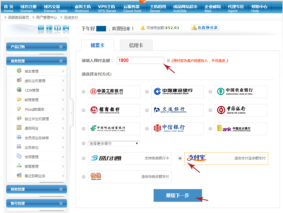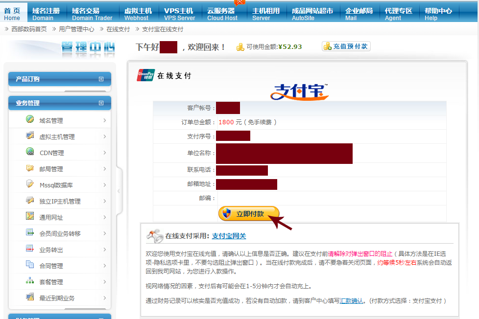 1. 進入在線支付中心,輸入支付金額,并選擇支付寶接口進行支付!如下圖所示!